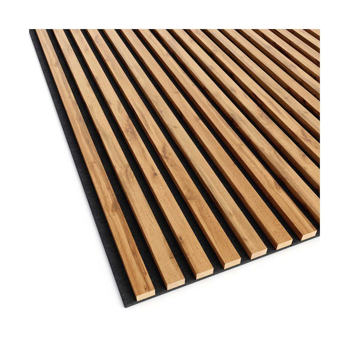 Oferowane przez nas lamele wykończone laminatem w kolorze dąb wotan przymocowane są do czarnego, szarego lub beżowego (do wyboru) filcu akustycznego o grubości 8 mm i dużej gęstości, który skutecznie wygłusza przestrzeń.