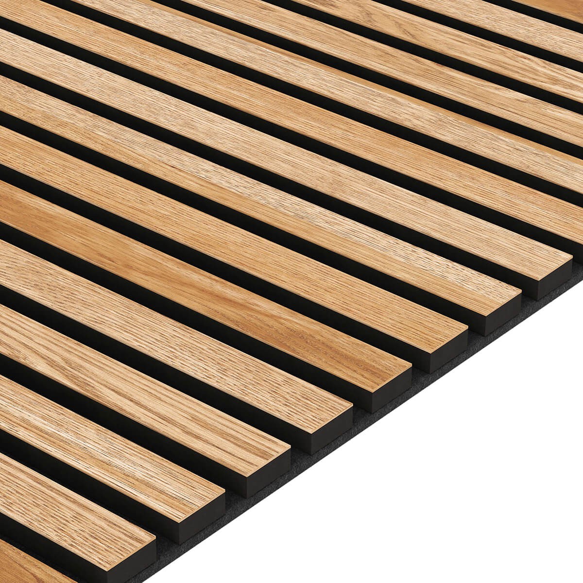 Oferowane przez nas lamele wykończone fornirem naturalnym przymocowane są do czarnego filcu akustycznego o grubości 7 mm i dużej gęstości, który skutecznie wygłusza przestrzeń.