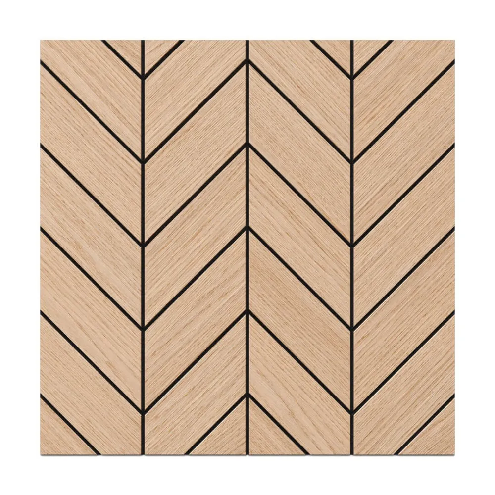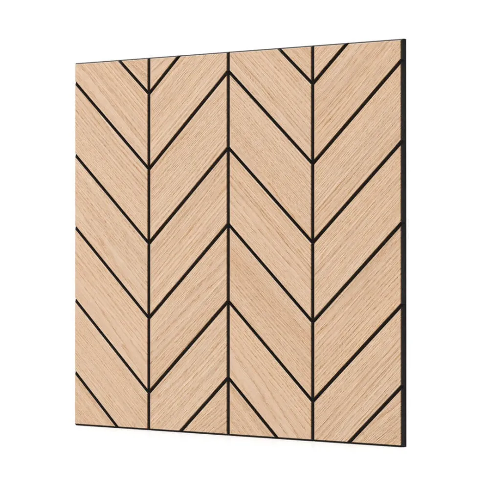 Vario to stylowy panel ścienny, frezowany o wymiarze 50x50 cm przyciągający uwagę modnym i klasycznym wzorem jodełki oraz naturalnym fornirem dębowym. Wykonany z solidnej, czarnej płyty MDF o grubości 1,1 cm pokryty naturalnym, surowym, nie olejowanym fornirem dębowym (do olejowania). Sprawdzi się w salonie, biurze i wnętrzach komercyjnych. Montaż możliwy na ścianie i suficie.