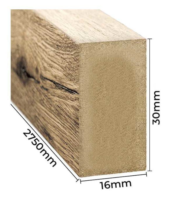 Naturalne listwy w czterostronnej okleinie drewnianej o wymiarach 16x30x2750 mm, z możliwością samodzielnego przycięcia według indywidualnych potrzeb.