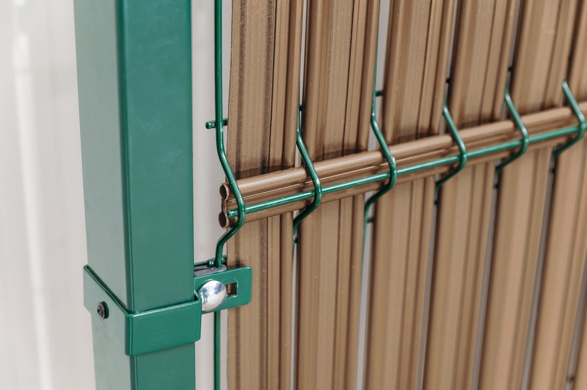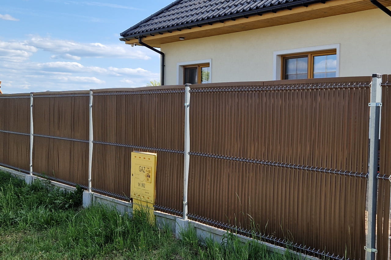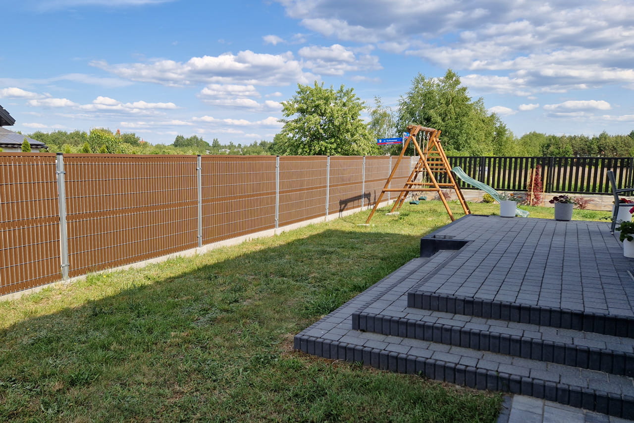 Osłona w postaci listew z tworzywa sztucznego wsuwanych w ogrodzenie panelowe do samodzielnego montażu.