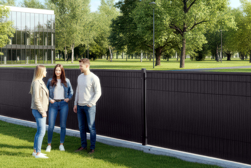 Osłona w postaci listew z tworzywa sztucznego wsuwanych w ogrodzenie panelowe do samodzielnego montażu.