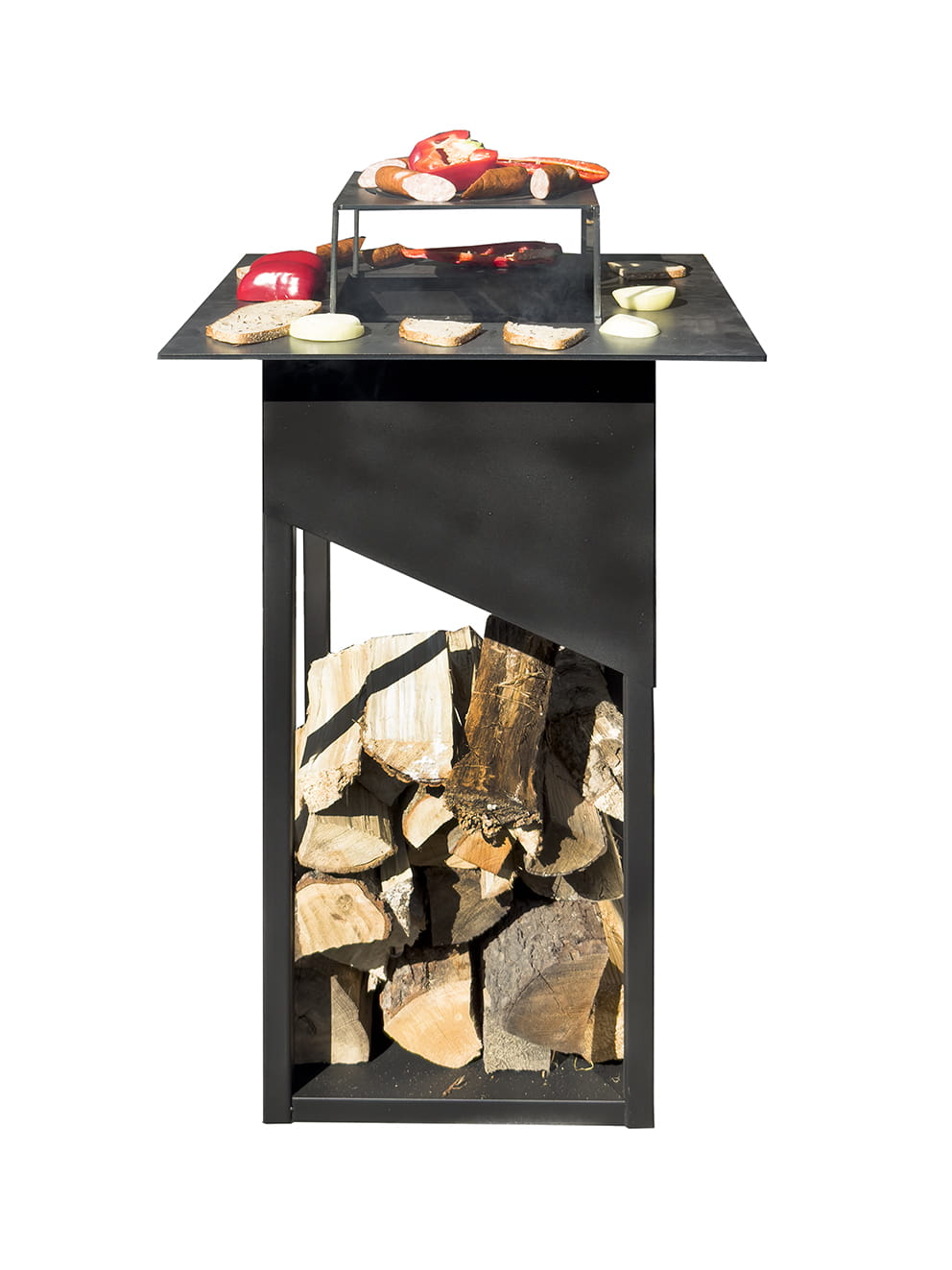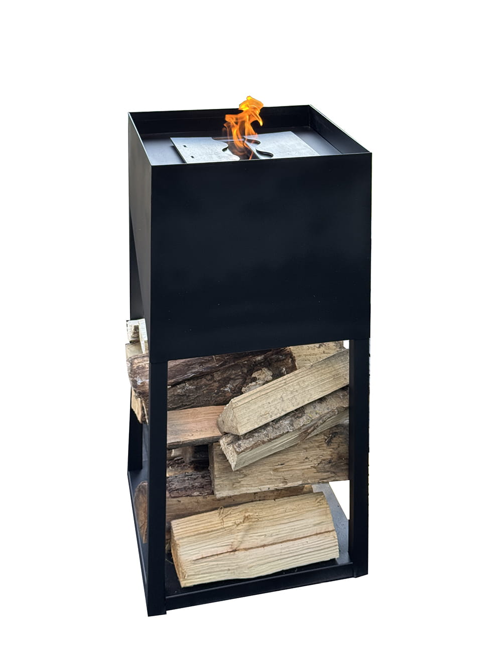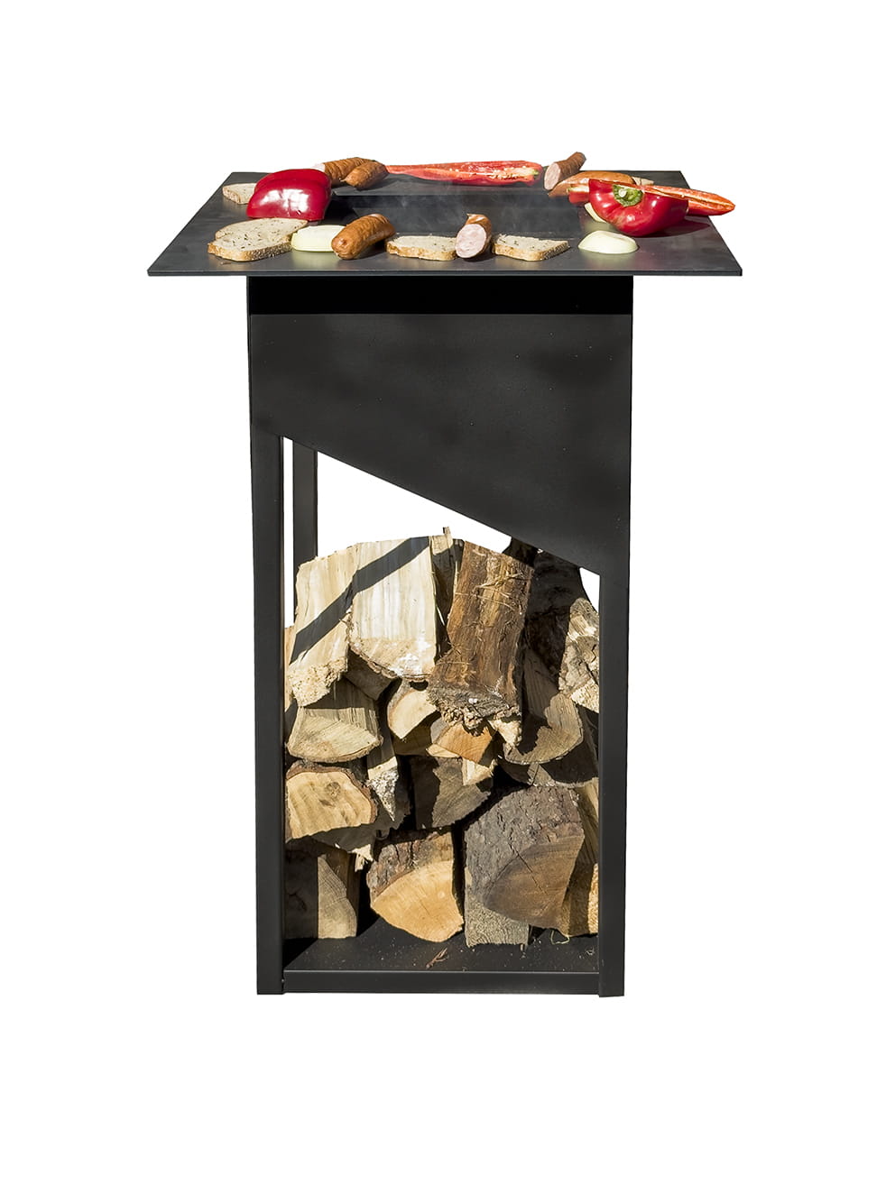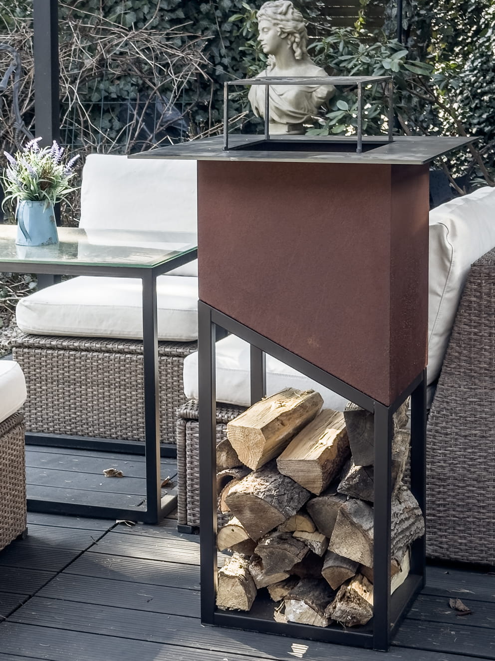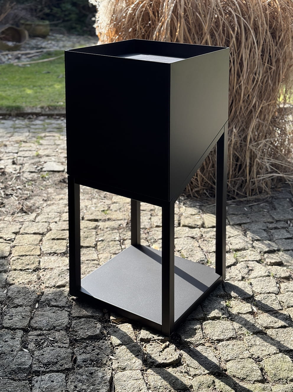 Konstrukcja wykonana została z grubej stali (1,5 mm) malowanej proszkowo farbą termoodporną w kolorze czarnym lub w wersji Rust (efekt rdzy cortenowskiej). Dzięki temu urządzenie jest odporne na warunki atmosferyczne i zachowuje swój wygląd przez długi czas. Minimalistyczna forma sprawia, że doskonale wpisuje się zarówno w nowoczesne, jak i industrialne aranżacje ogrodowe.