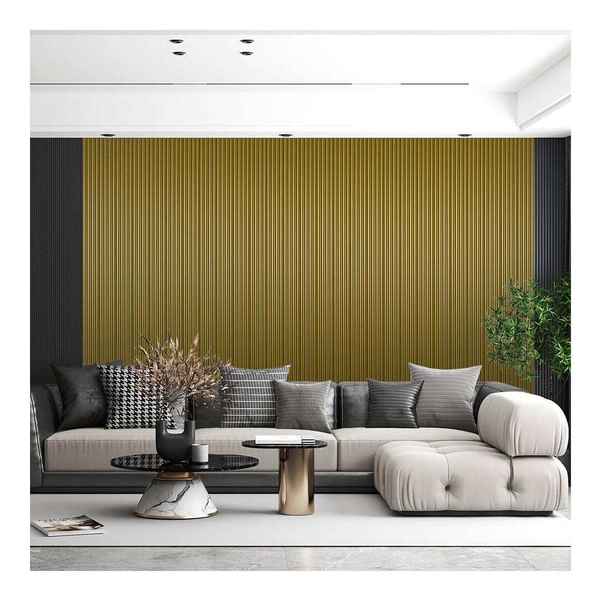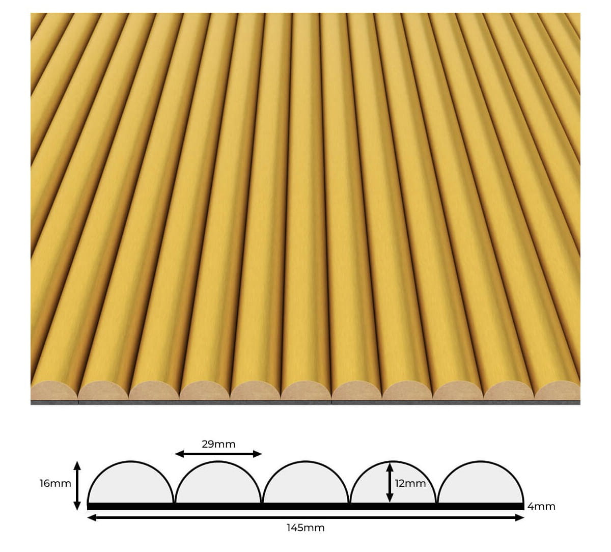 Panel ryflowany to element, który wpłynie na estetykę Twojego wnętrza oraz poprawi jego akustykę. Drewniane panele akustyczne charakteryzują się wyjątkowym designem, tworzącym efekt optycznego załamania światła. Panele ścienne ryflowane w odcieniu złotym to elegancka opcja, która nadaje wnętrzom kunsztu i stylu. Panele ryflowane łączą funkcjonalność i estetykę. Ryflowane panele składają się z pięciu owalnych listew z laminowanego MDF, umieszczonych na czarnym filcu o grubości 4 mm. Wzór ryfli oraz ich błyszcząca powierzchnia tworzą wyjątkowy efekt. Wybierając złote panele ryflowane, wprowadzisz do swojej przestrzeni elegancję oraz nowoczesny charakter.