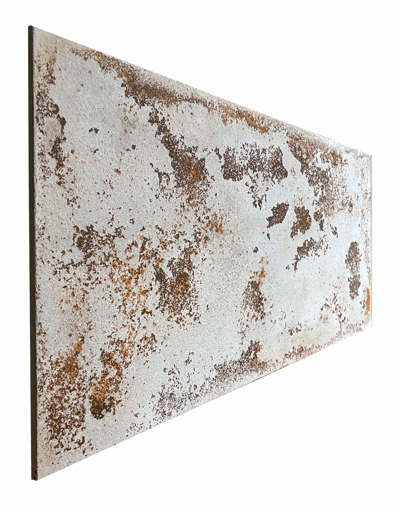 Powierzchnia płyt wzbogacona jest o dekoracyjny efekt prawdziwej rdzy inspirowanej stalą corten. Naturalny proces tworzenia struktury powoduje, że rozmieszczenie oraz intensywność rdzy na każdej płycie jest inne. Dzięki temu powstaje autentyczna, niepowtarzalna kompozycja, której nie da się osiągnąć przy użyciu nadruków czy imitacji.