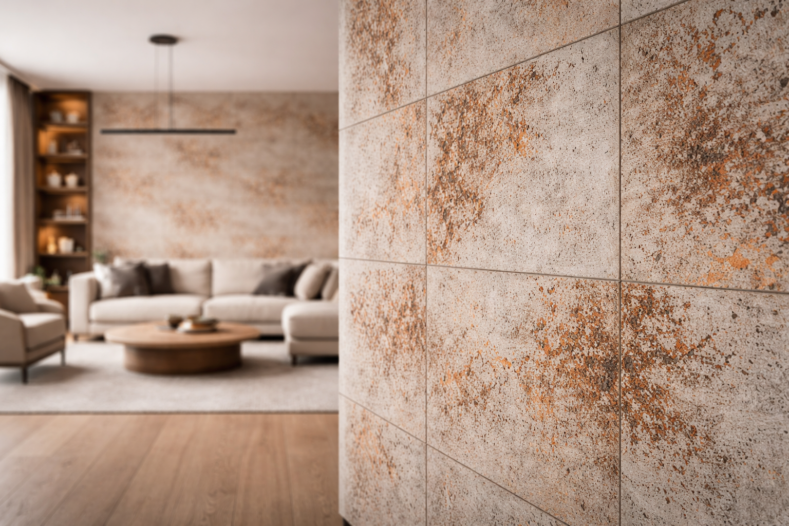 Efekt corten pięknie współgra z betonową fakturą, tworząc wyrazisty akcent dekoracyjny, który zmienia zwykłą ścianę w nowoczesną, architektoniczną powierzchnię.