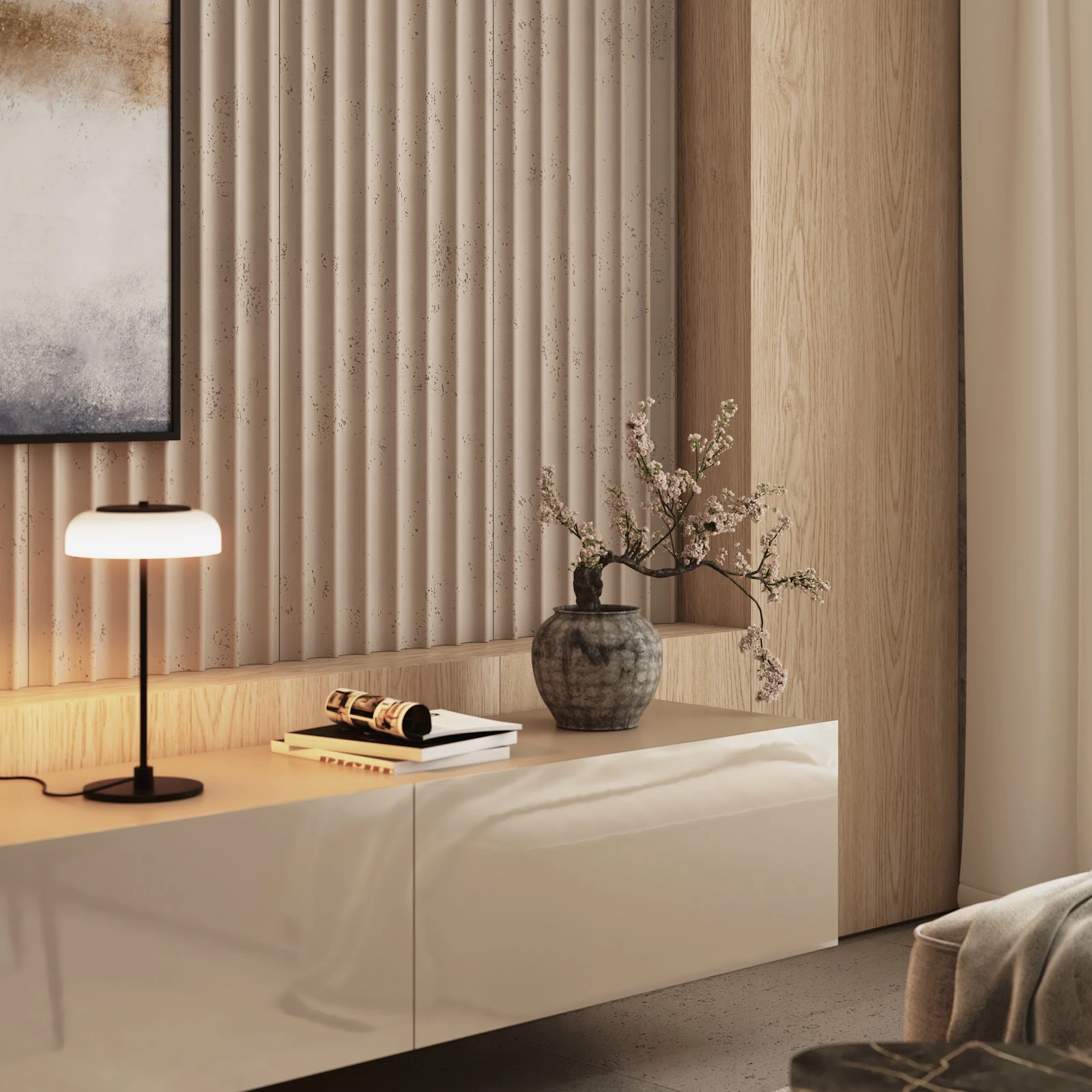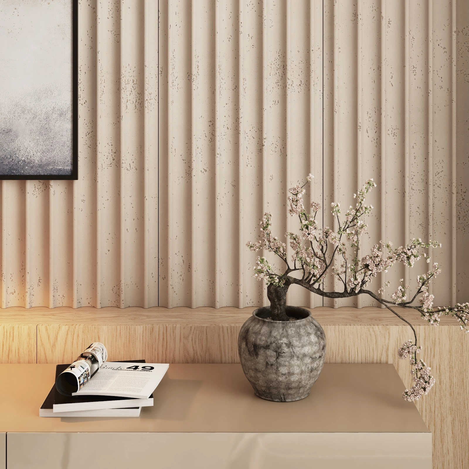 Niezwykle efektowny panel ścienny o przestrzennej, oryginalnej powierzchni, wykonany z najwyżej klasy betonu architektonicznego.
