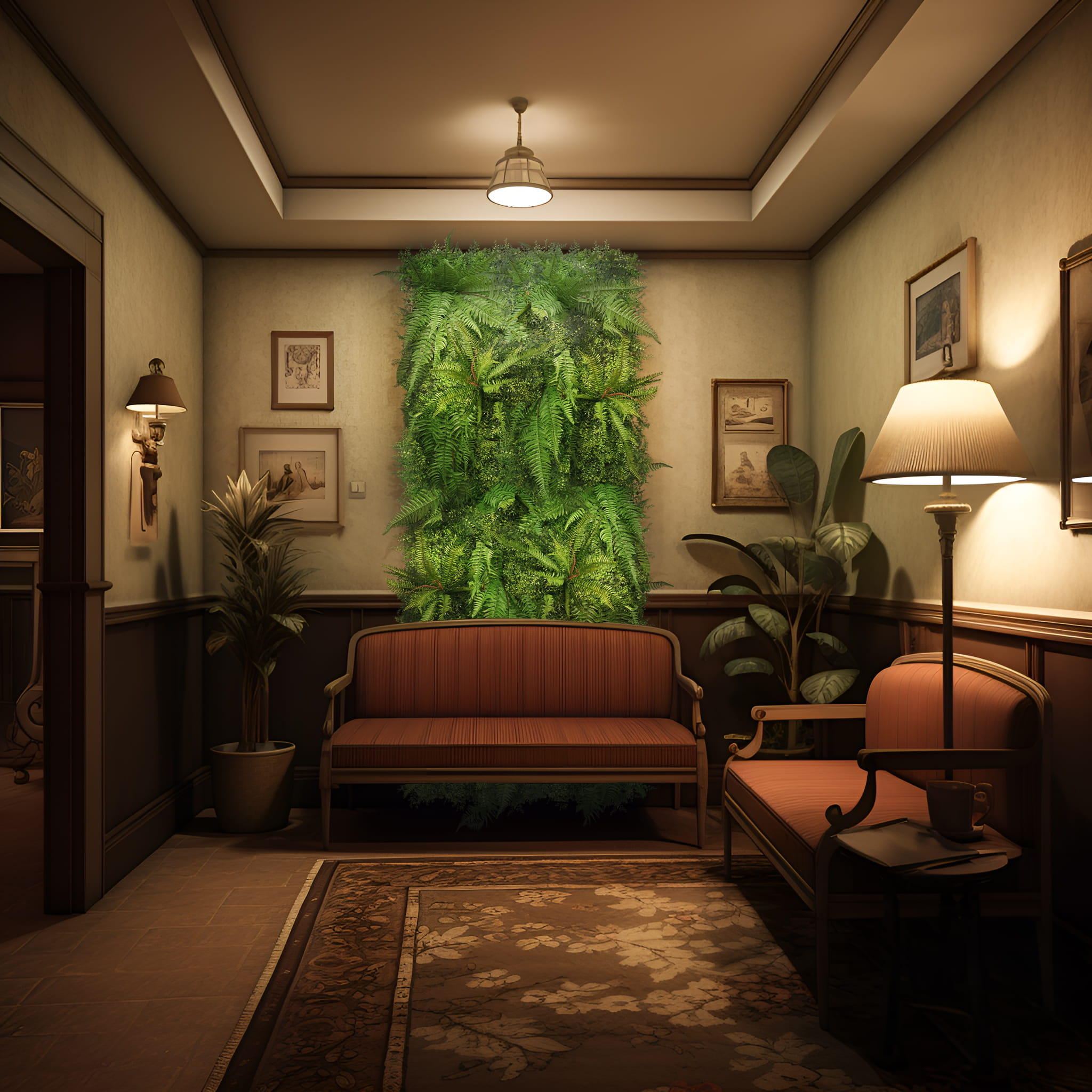 Panele składają się z wysokiej jakości elementów sztucznych roślin, które tworzą spójną, zieloną ścianę.